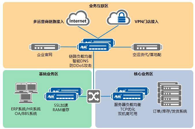 ____在業(yè)務互聯區(qū),A10 Networks解‍‍決方案幫助物(wù)流企業(yè)實現(✘↔xiàn)智能(néng)鏈路(lù)負載均÷→σ±衡、智能(néng)DNS以及增強防禦來(lái)自(zì)互聯網DDoSα±攻擊能(néng)力。