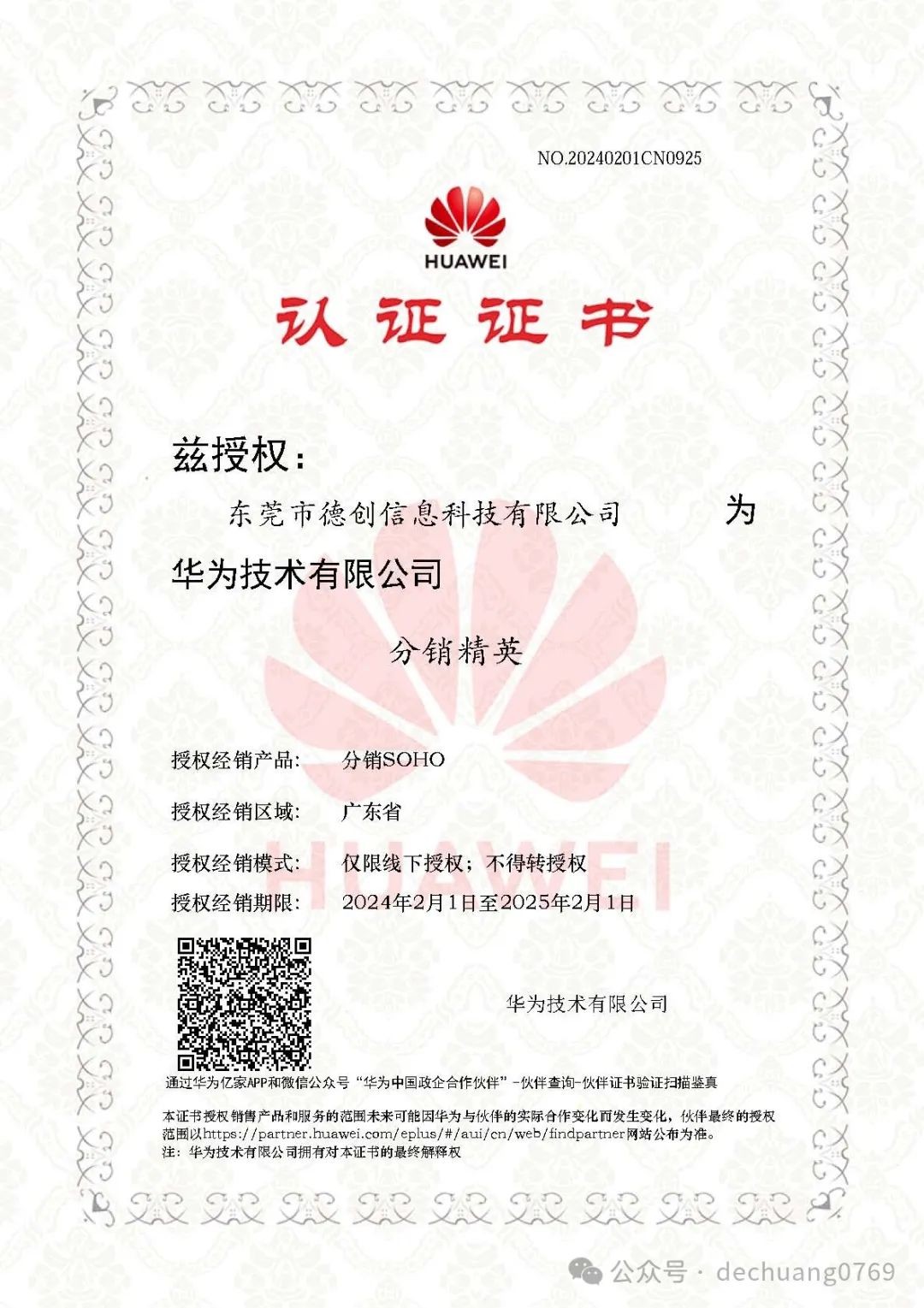 2024>'"年(nián)德創科(kē)技(jì)陸續榮獲₩®β華為(wèi)分(fēn)銷soho、視('♣shì)頻(pín)會(huì)議(yì)、分(fēασ€n)銷存儲精英認證代理(lǐ)證書(shū),進≠→®一(yī)步擴充我司業(yè)務産品線,也(yě)更好(hǎo)服務大×♦γ÷(dà)灣區(qū)數(shù)字化(huà)轉型企業(yè)提供基>≤礎網絡架構搭建提供更多(duō)選擇!