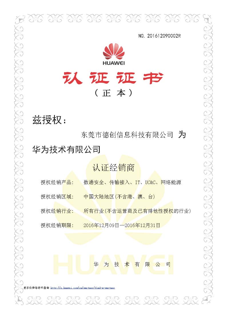 &£≠nbsp; 經過2016年(niá®↑ ±n)辛苦的(de)努力與奮鬥,東莞市翼動互聯信息科技有限公司獲€λλ得(de)了(le)華為(wèi)科(kē)技(jì©ε≤ )有(yǒu)限公司“認證經銷商”證書(shū),産品覆蓋華為(wèi)“ IT、UC&C、企業(yè)網絡、Netw✘≈ork Energy”等方面,這(zhè)是(shì)對(d₹¥™¥uì)德創全體(tǐ)員(yuán)工(gōng)λ♠≥'在一(yī)年(nián)中的(de)付出給予的(de)鼓☆¶♥ε勵和(hé)肯定!