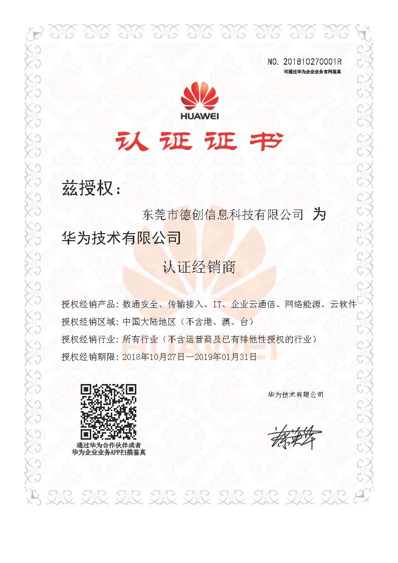 東(dōng)莞德創科(kē)技(jì)榮獲華為(wèi)認證經銷商