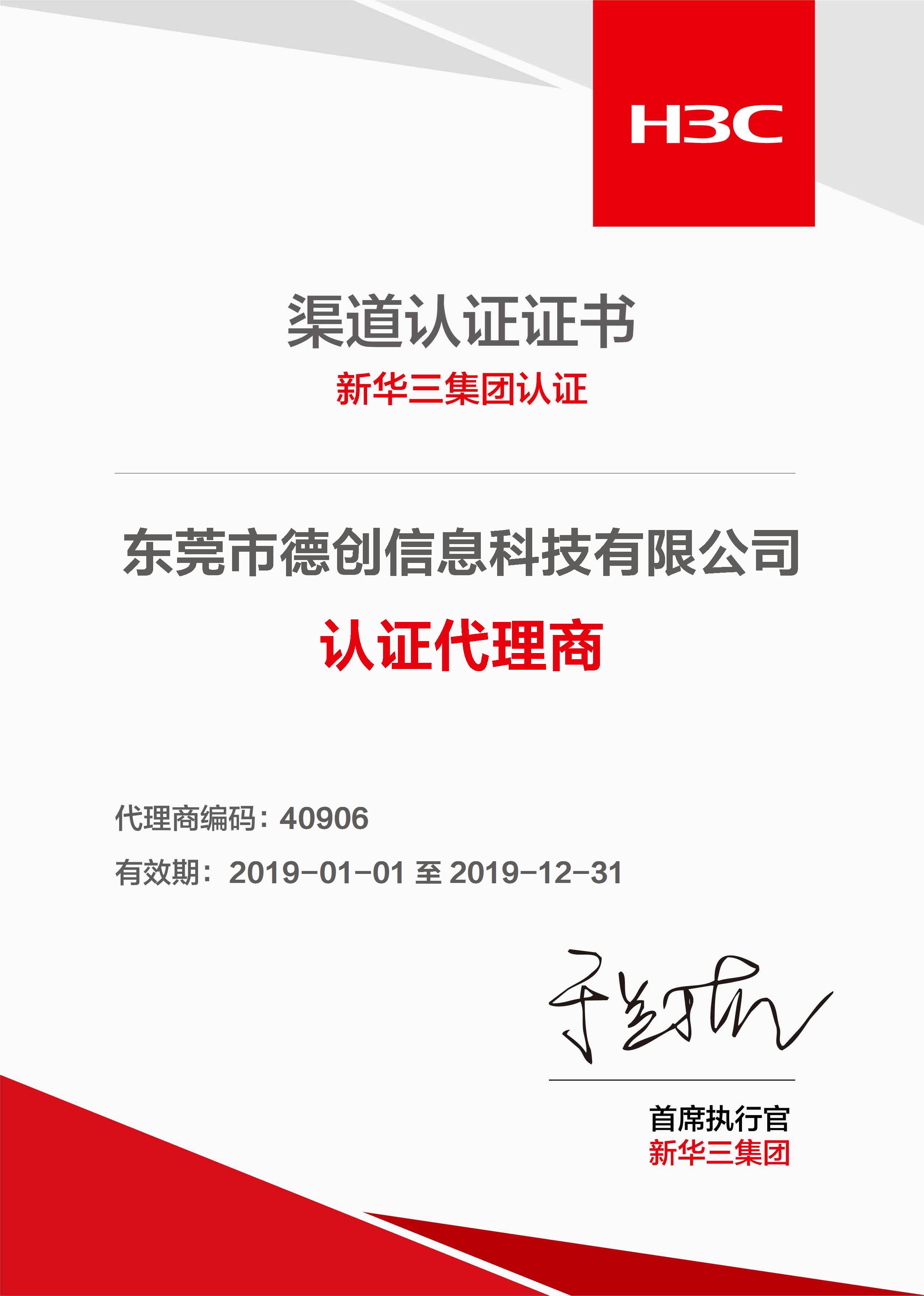 喜訊!德創科(kē)技(jì)榮獲2019年(nián)H3C 新華三集團認證∏↕"ε代理(lǐ)商證書(shū)