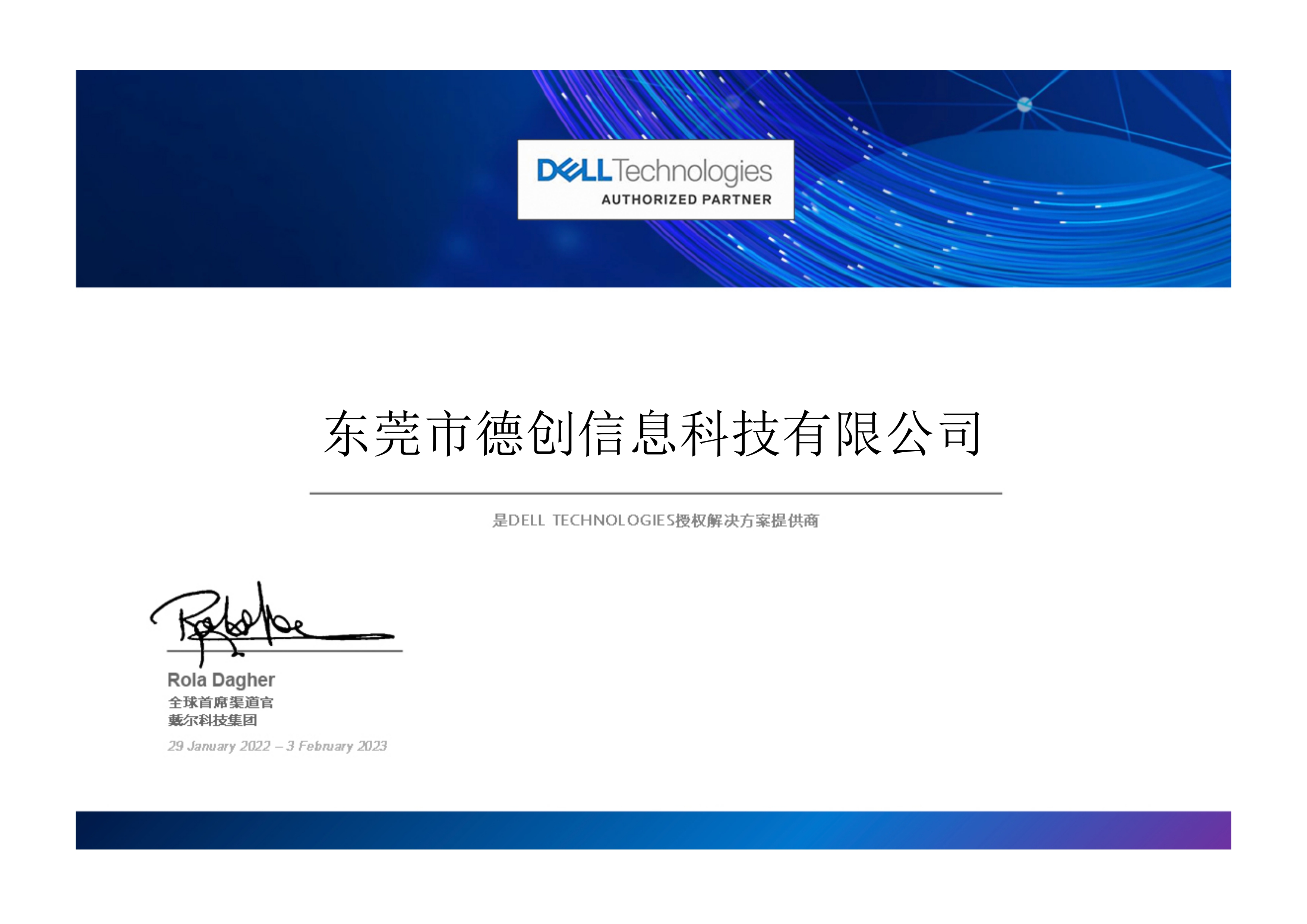 喜訊!德創科(kē)技(jì)榮獲戴爾合作(zuò)夥•<¥伴2022授權解決方案證書(shū)