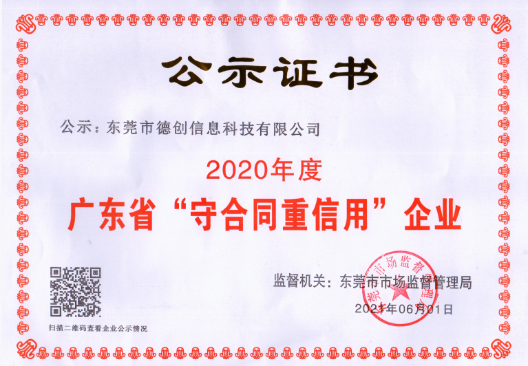 熱(rè)烈祝賀德創信息科(kē)技(jì)連續四年(niá≤ ↓n)(2017年(nián)-2020年(nián))榮獲“廣東(dōng)省守合同重信用(yòn¥<↑÷g)企業(yè)”證書(shū)!