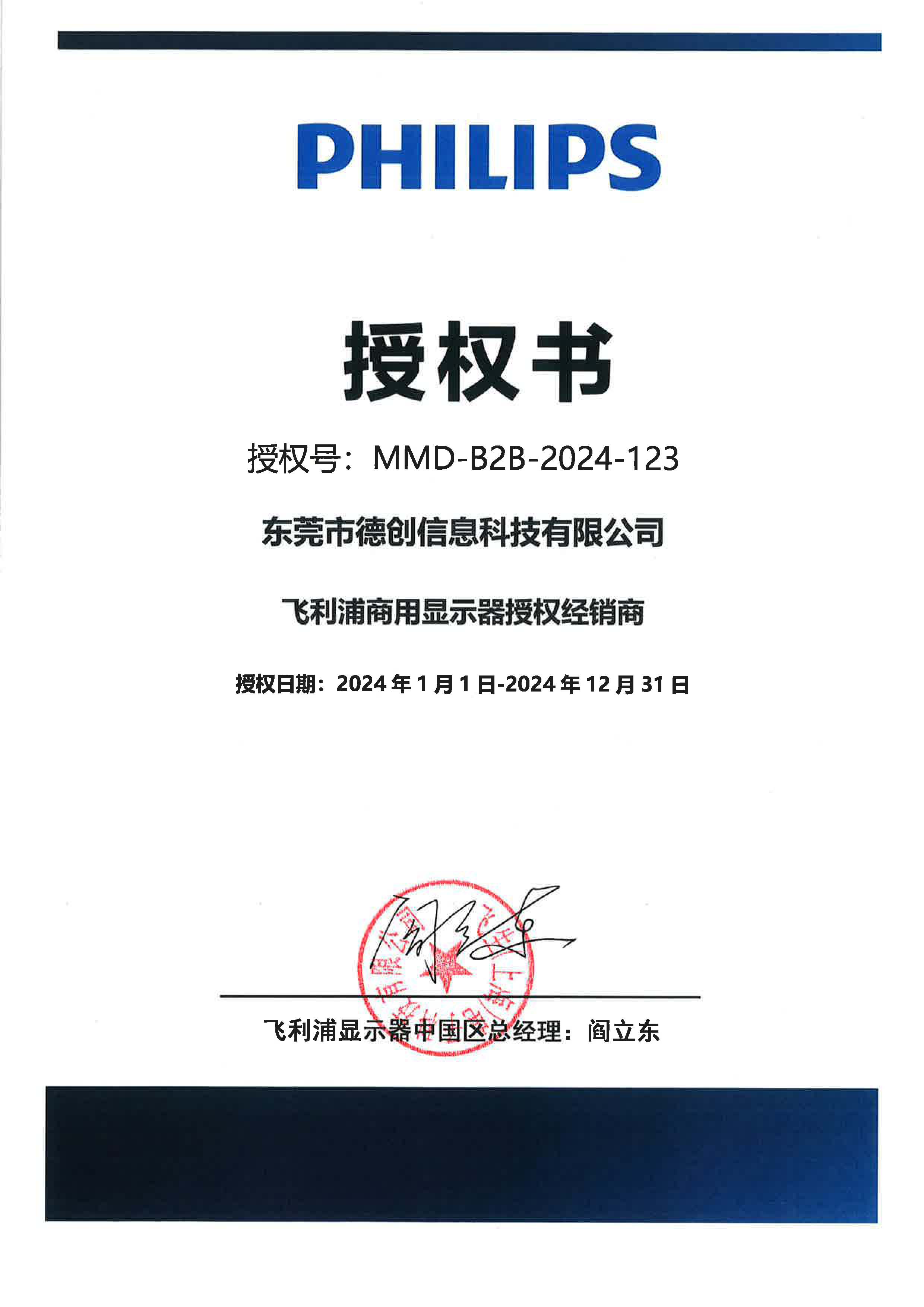德創科(kē)技(jì)榮獲“飛(fēi)利浦商用(yòng)顯示♥§‌器(qì)授權經銷商”證書(shū)!